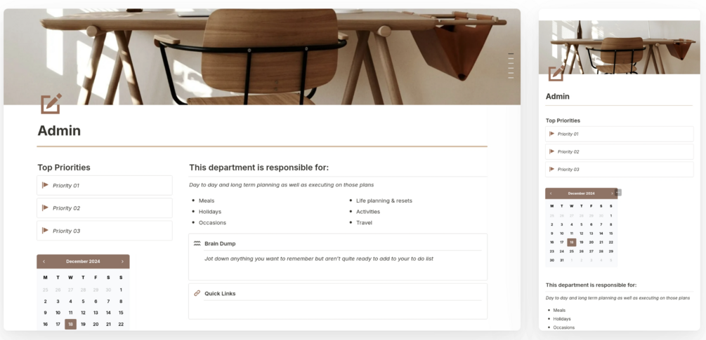 The home page of your notion planner serves as a dashboard giving you a bird’s eye view of your priorities, schedule, goals and to-dos.