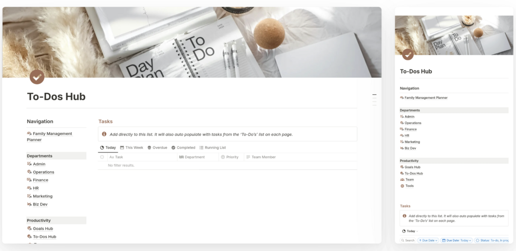 -To Dos: Each page has a to-do list with views filtered by due date. My practice is to start each week by adding and checking things off the to-do list on each department’s page. Whatever you add here will roll up to the lists found on the Family Planner and To-Dos Hub pages.